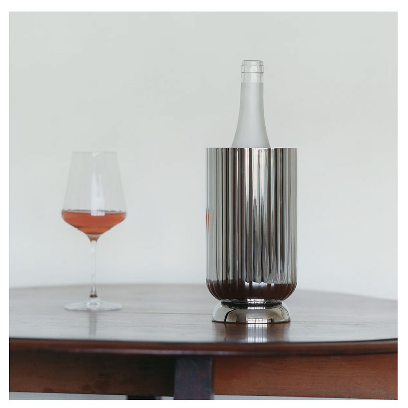 115170Ideal para recibir invitados y añadir un toque único a cualquier mesa, esta vinoteca de acero inoxidable presenta el diseño acanalado característico de la colección Bernadotte con sutiles guiños al Art Déco. Una perfecta fusión de forma y función, su construcción de doble pared mantiene las botellas frías durante más tiempo.