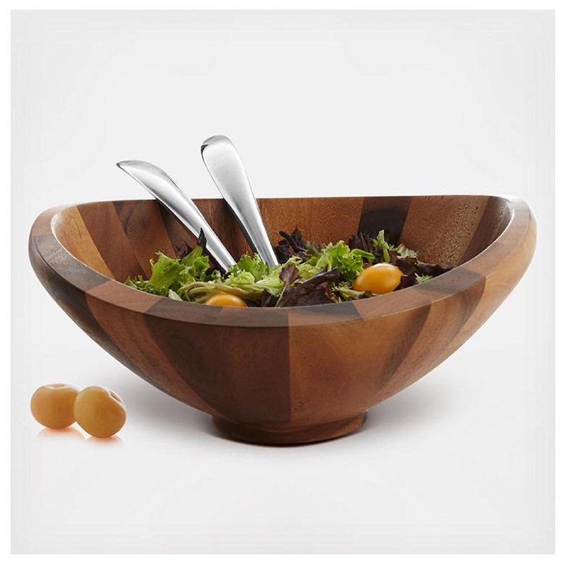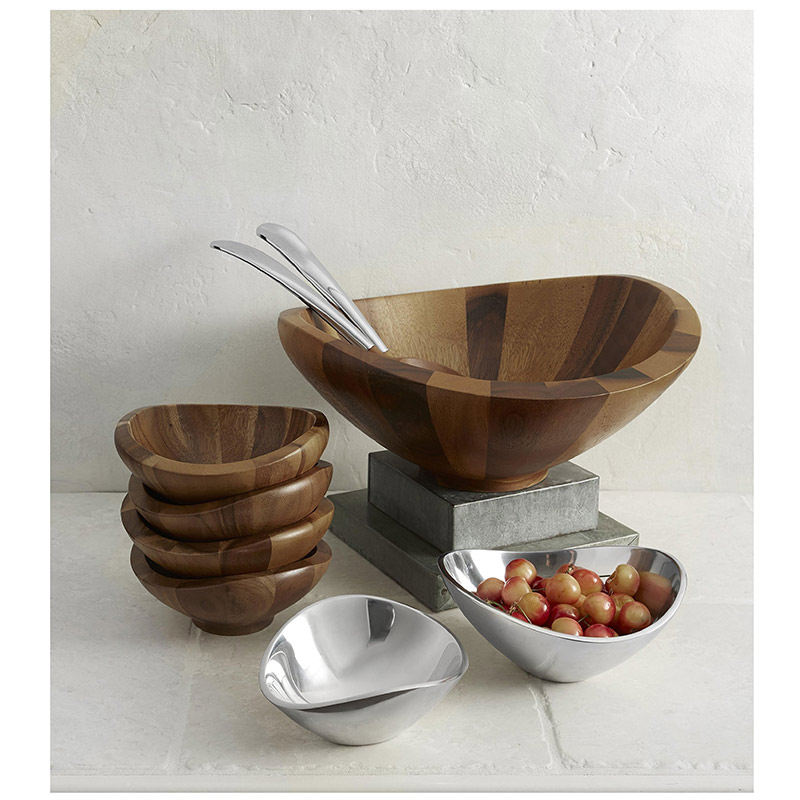 Irresistible al tacto y a la vista, el juego de ensalada Butterfly aporta una serena belleza a las verduras frescas y garantiza una funcionalidad relajada para el cocinero. Creado para Nambé por el diseñador Sean O’Hara, este juego combina madera noble con una aleación brillante para lograr una apariencia a la vez elemental y moderna. Sus líneas ascendentes y amplias, un interior ahuecado y una base elegante crean un espacio que rinde homenaje a su homónimo. Su diseño inteligente y cuidado resalta la atractiva veta de la madera de acacia desde todos los ángulos y realza la belleza ondulada del borde.