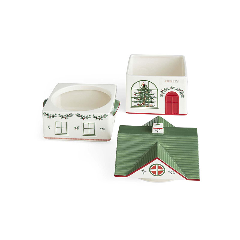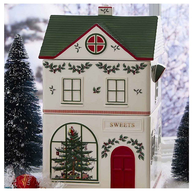 Este encantador bote apilable con diseño de pueblo navideño añade un toque festivo y original a tu cocina. Fabricado en cerámica, este bote imita una antigua tienda de dulces con una alegre puerta roja, ventanas arqueadas y un encantador techo verde. Con tres compartimentos, este versátil bote es perfecto para guardar una variedad de dulces navideños, ingredientes para hornear u otros artículos esenciales de cocina.