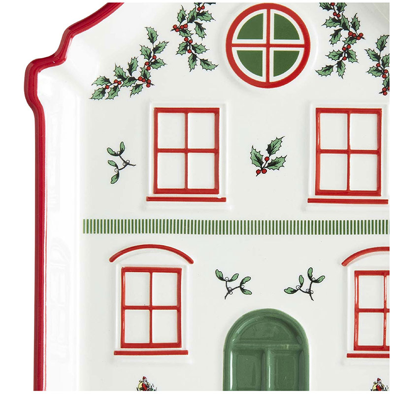 Esta bandeja navideña con forma de pueblo de árboles tiene la forma de la fachada de una encantadora casa, añadiendo un toque festivo y original a tu mesa navideña. La casa cuenta con una alegre puerta roja, acogedoras ventanas verdes y, a través de una de ellas, se puede ver el icónico árbol de Navidad Spode. Perfecta para servir aperitivos, salsas y aderezos, o como pieza decorativa en la repisa de la chimenea o la mesa del comedor.