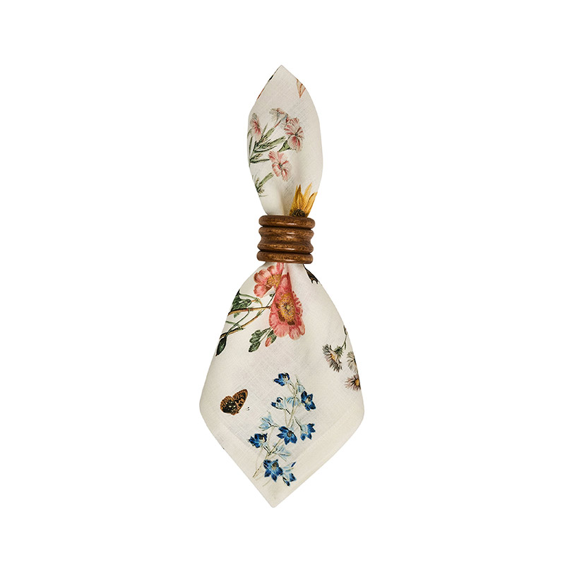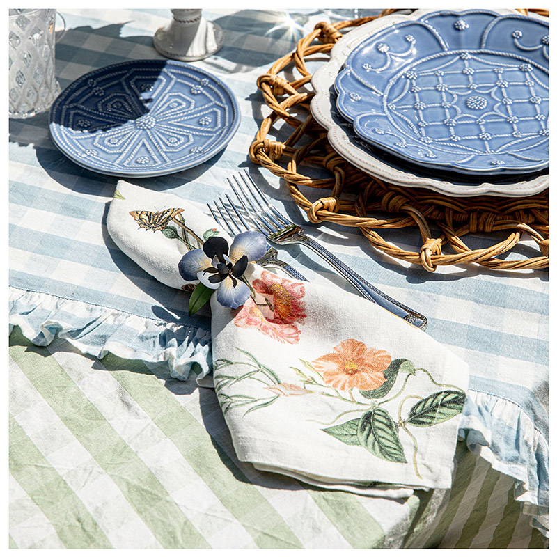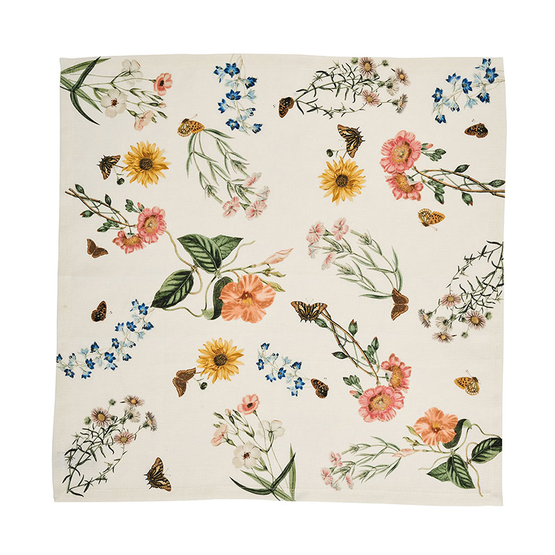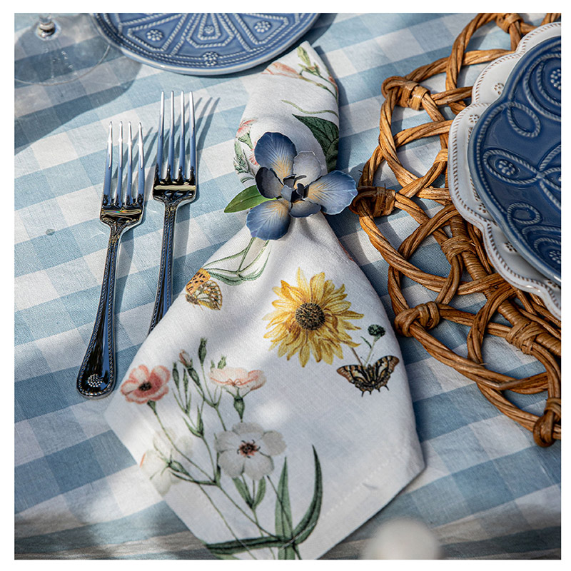 Girasoles, flores y mariposas de colores vibrantes en una paleta suave y soñadora sobre un fresco fondo de lino blanco hacen que estas servilletas, irresistiblemente idílicas, sean fáciles de combinar con otras colecciones y para cualquier ocasión. Nos encantan especialmente para disfrutar de un relajado brunch dominical, picnics y fiestas en el jardín.