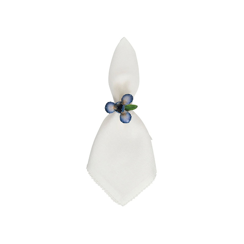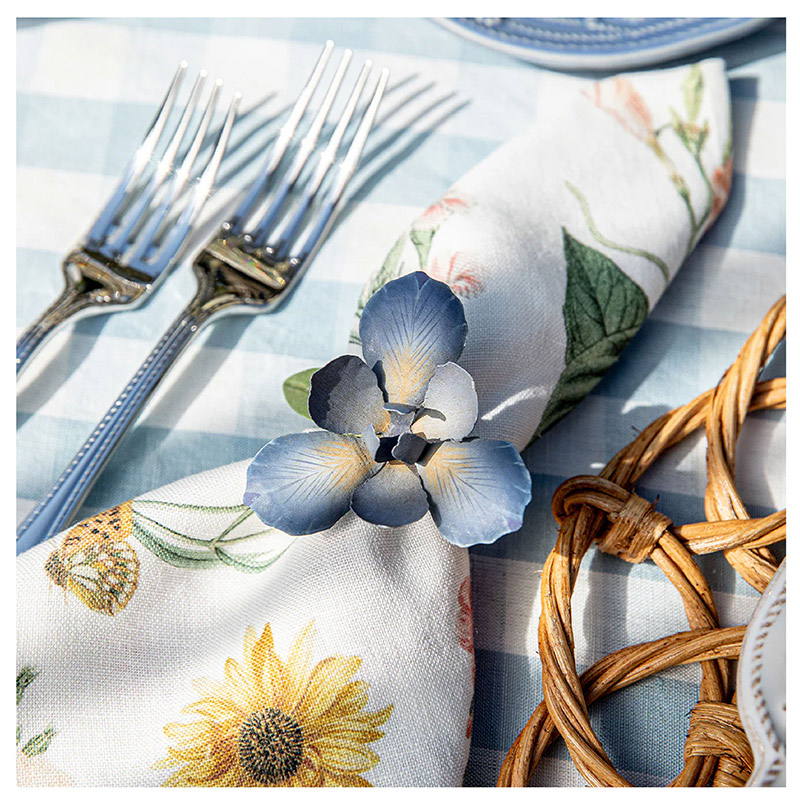 Este juego de 4 servilleteros Iris, un toque final encantador para cualquier mesa de primavera o verano, está hecho de metal pintado a mano con gran detalle en tonos azules de chambray de ensueño y verdes frescos sobre un anillo dorado brillante con diseño en espiral.
