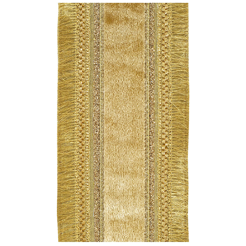 Unos opulentos flecos dorados adornan los laterales de esta lujosa cinta de terciopelo afelpado, cosida a una base de dupioni dorado metalizado. Esta fina cinta tiene un acabado firme que le permite mantener su forma.