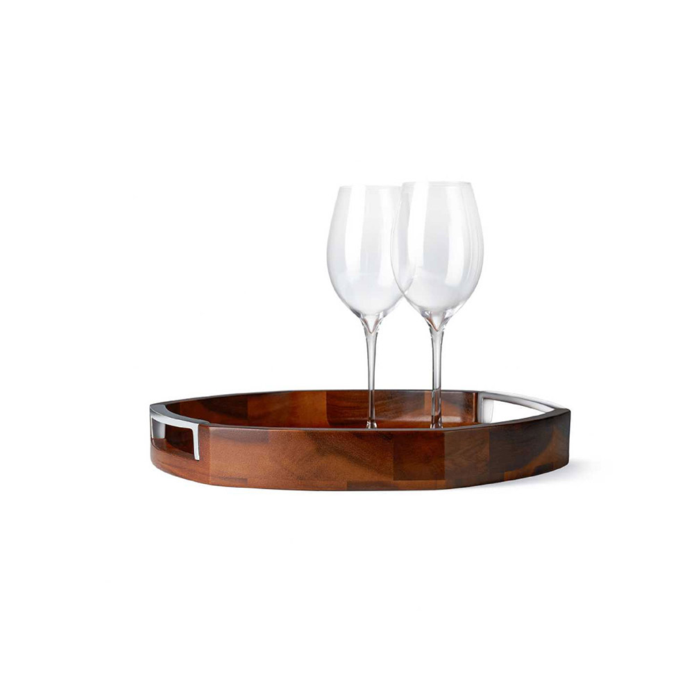 La bandeja con asas de remache es un elemento esencial para el entretenimiento que añade un toque de distinción a cualquier mesa. Combina la rica madera de acacia con la aleación Nambé para lograr un estilo a la vez clásico y moderno. Con líneas definidas que forman una elegante silueta y un interior cóncavo, esta pieza es ideal para quienes disfrutan recibiendo invitados y organizando reuniones.
