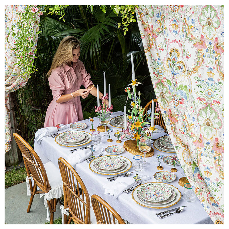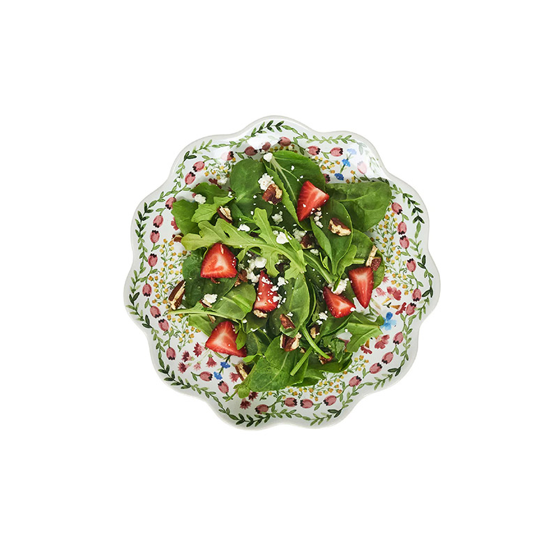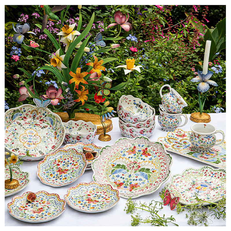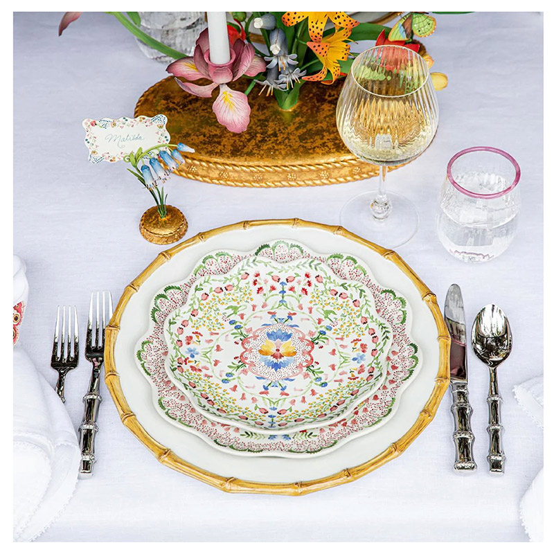 Este vibrante motivo de enredaderas ondulantes, flores desplegadas, diminutas flores y bayas rebosa de vida para alegrar tu mesa. Un ingenioso equilibrio entre lo suntuoso y lo caprichoso, este dulce plato presenta un borde romántico con volantes, ideal para combinar con otras piezas, en una paleta pictórica de rosas pétalos, verdes jardín, azules iris y amarillos narcisos.