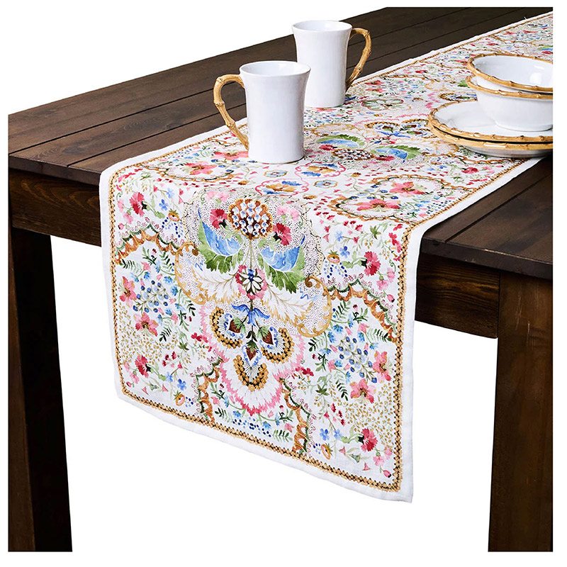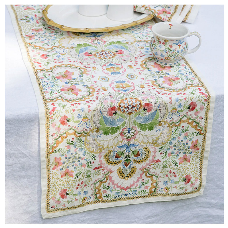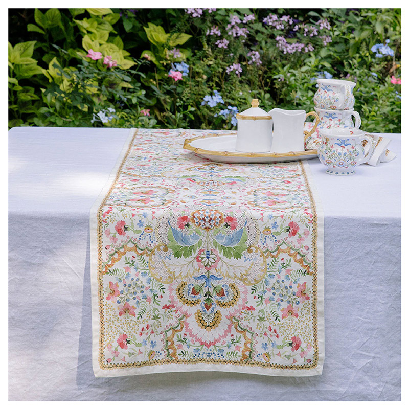 Inspirado en flores silvestres y acuarelas, este vibrante y romántico camino de mesa de lino anima cualquier ambiente con su floreciente belleza, sus caprichosas flores y sus intrincados detalles. Rebosante de vibrantes tonos de rosa pétalo, verde jardín, azul iris y amarillo narciso sobre un fondo crema, este versátil lino facilita la combinación, ideal para ocasiones formales o informales, tanto para las fiestas de primavera como para las veladas de verano y cualquier otra ocasión.