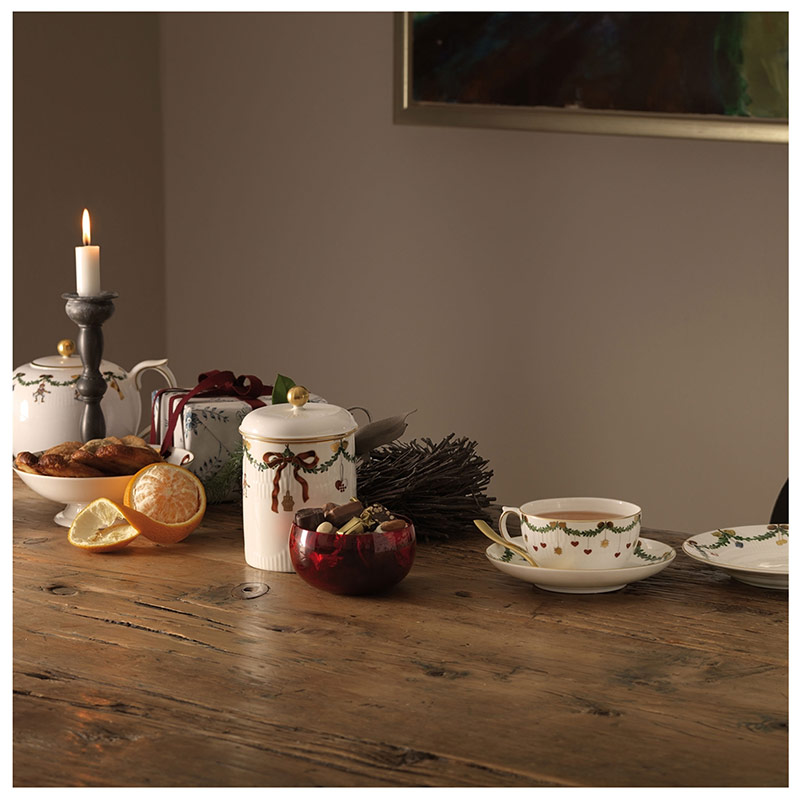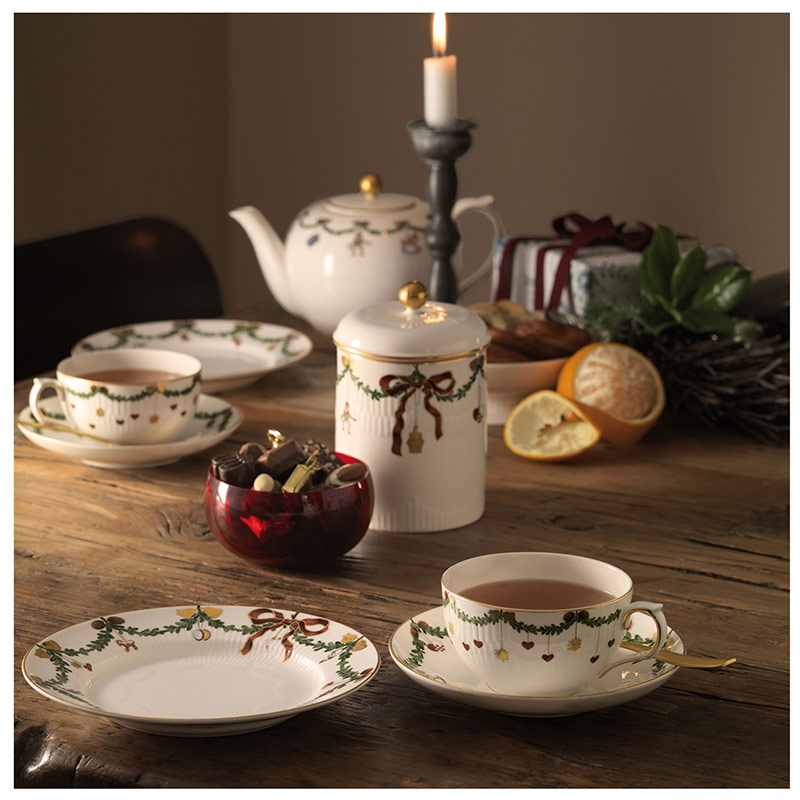 113677Crea un ambiente acogedor para las tranquilas veladas navideñas alrededor de la mesa con esta taza y platillo del entrañable diseño navideño Star Fluted. La taza está adornada con guirnaldas de abeto, corazones, campanillas, piñas y estrellas que irradian alegría navideña. Esta taza y platillo de 32 cl cuenta con un asa de estilo romántico, decorada con detalles dorados que también se repiten en el borde de la taza y el platillo. La apreciada vajilla navideña de Royal Copenhagen cobra vida cada Navidad y se ha convertido en parte de muchas tradiciones festivas. Las festivas guirnaldas de abeto que bordean los platos, cuencos y tazas están adornadas con lazos de cinta de seda y decoraciones navideñas, creando una presentación rica y elegante, el marco perfecto para todas sus alegres comidas navideñas.