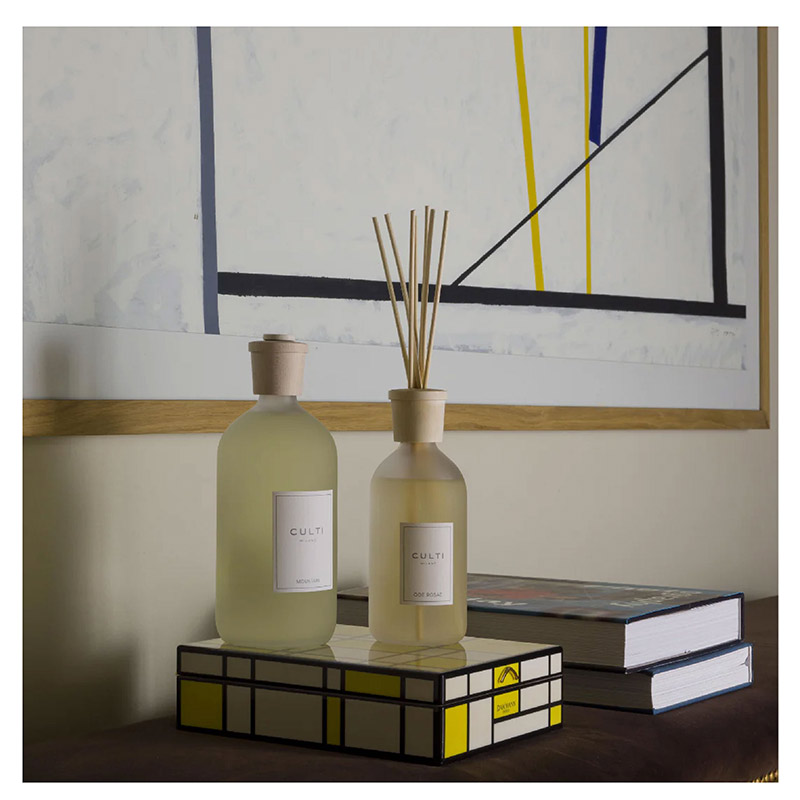 La botella cilíndrica de vidrio con etiquetas de color marfil y un tapón de madera de arce natural distinguen la estética pura y elegante de la línea CULTI STILE.