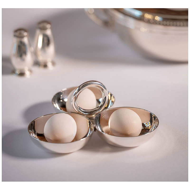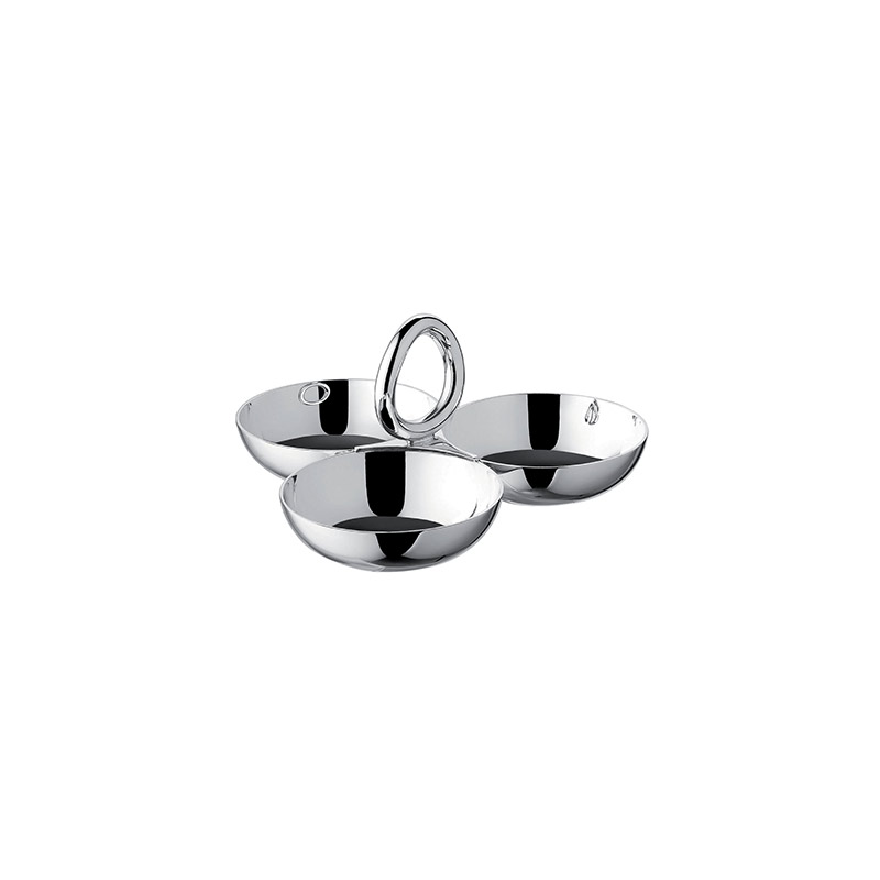 La fuente Vertigo plateada cuenta con tres cuencos pequeños conectados por un asa circular. Es perfecta para servir frutos secos, aceitunas y otros aperitivos ligeros. El audaz motivo de Vertigo, un anillo grueso, sutilmente asimétrico y colocado de forma divertida, se encuentra en cada pieza de la colección diseñada por Andrée Putman.